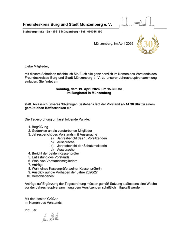 schon dreißig Jahre ist es her, dass der Freundeskreis Burg und Stadt Münzenberg e. V. aus der Taufe gehoben wurde. Dies geschah am 19. April 1996. Daher laden wir euch auch genau am 19. April, nur 30 Jahre später, ganz herzlich zu unserer diesjährigen Jahreshauptversammlung ein. Beginnen möchten wir gerne um 14.30 Uhr mit einem gemütlichen Kaffeetrinken im Burghotel Münzenberg, an das sich um 15.30 Uhr der offizielle Teil anschließt.